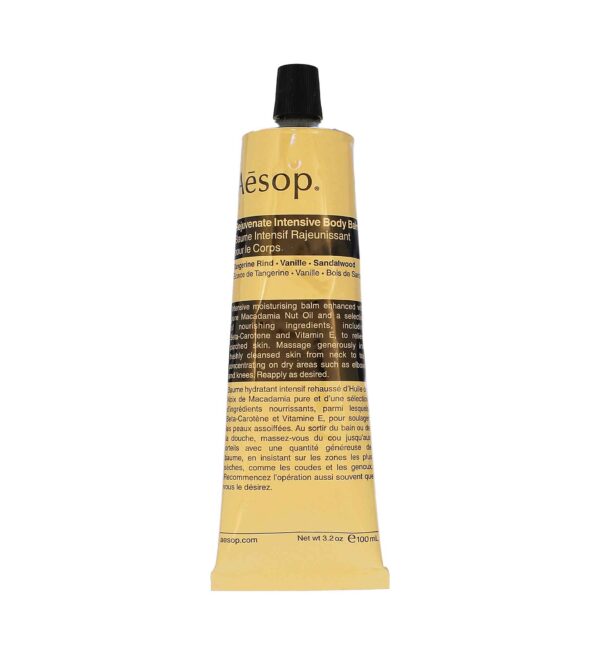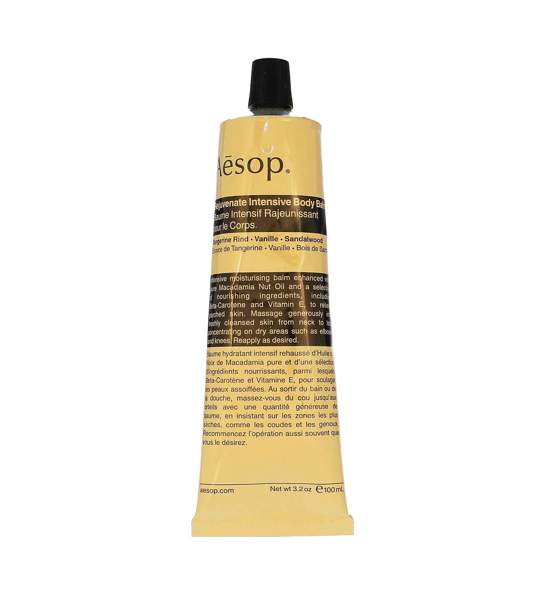Výjimečně hydratační tělový balzám Aesop Rejuvenate Intensive Body Balm vyživí a zklidní i tu nejsušší pokožku. Tento nemastný balzám obsahuje čisté oleje z makadamových ořechů a sladkých mandlí, které vyživují i ??ta nejsušší místa – je ideální pro použití na loktech, kolenech a chodidlech. Receptura je ovoněná aromatickou, hřejivou vůní vanilky, mandarinky a santalového dřeva pro jedinečný smyslový zážitek.