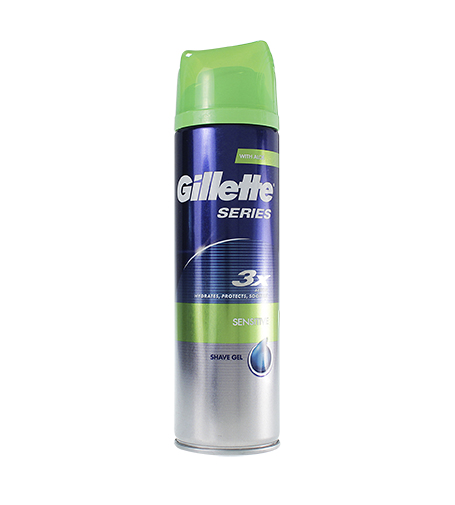 Pánský gel na holení Gillette Series Sensitive s trojnásobnými ochrannými účinky a aloe vera. Obsahuje účinné lubrikanty, které pomáhají chránit proti podráždění pokožky při holení. S jemnou vůní pro citlivou pokožku.