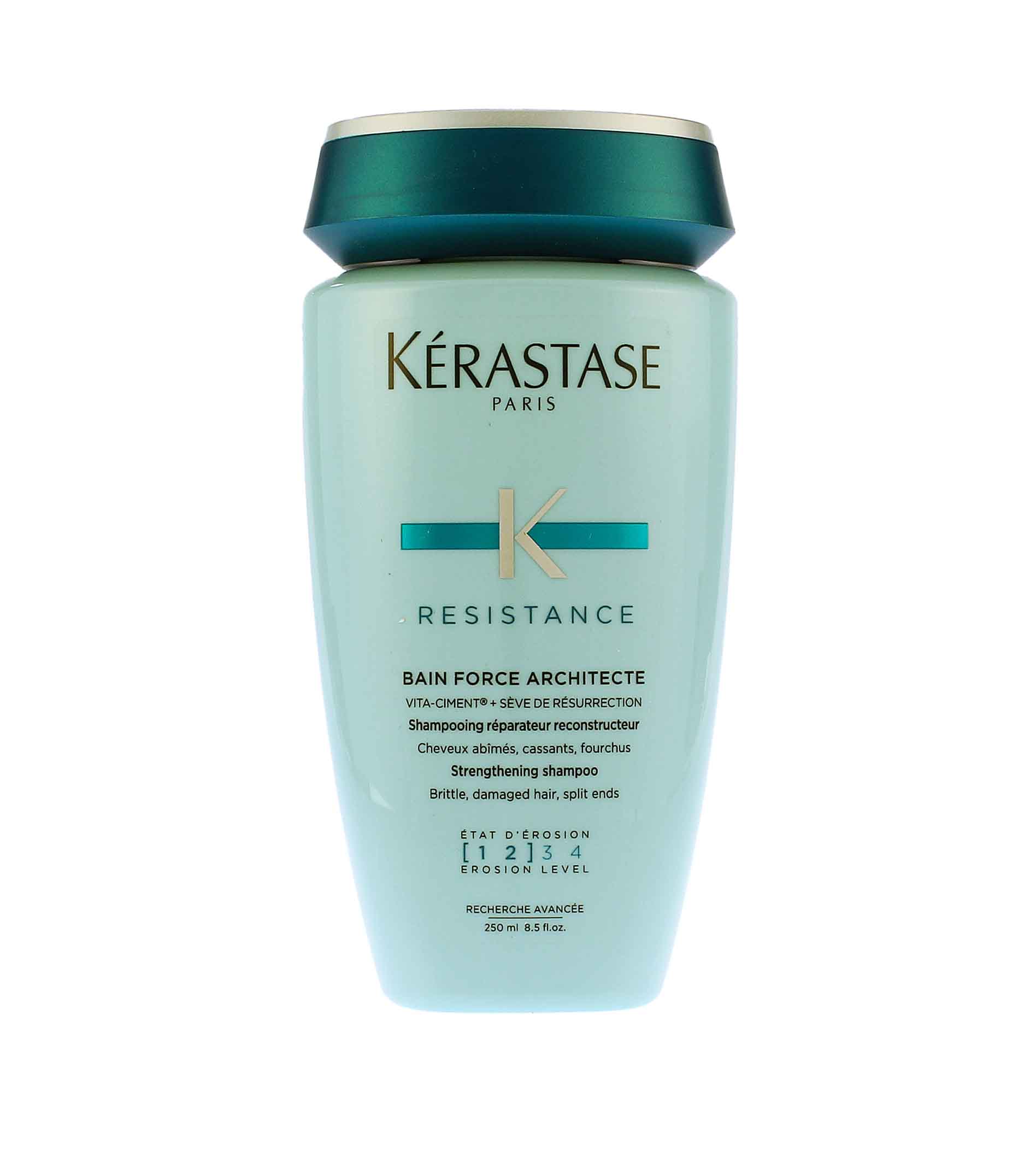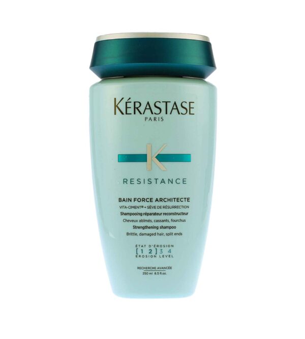 Luxusní šamponová lázeň Kérastase Resistance Bain Force Architecte byla speciálně vyvinuta pro všechny typy oslabených, poškozených a zcitlivěných vlasů. Kombinace komplexu Vita-Ciment® a Seve de Résurrection regeneruje a zpevňuje vlasové vlákno zevnitř, pro aktivní rekonstrukci a revitalizaci pro lesklé a hladké vlasy. Vlasy jsou hebké, lesklé, hladší a silnější.