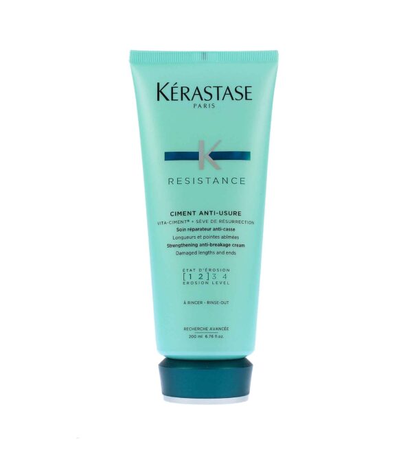 Lehká intenzivní péče s posilujícími účinky pro oslabené a lehce poškozené vlasy a roztřepené konečky. Kondicionér Kérastase Resistance Ciment Anti-Usure účinně obnovuje vnější i vnitřní vlasové struktury, dodává jim potřebnou výživu a hydrataci a svěží a zářivý vzhled plný objemu a vitality. Dvojím účinkem proniká do vlasového vlákna, kde obnovuje mezibuněčné pojivo, a vlas tak posiluje a chrání jej před negativními vlivy. Vlasy jsou silné na dotek, odolnější a snadno se rozčesávají.