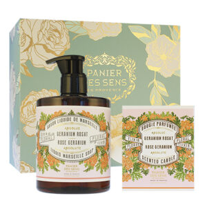 Panier Des Sens Rose Geranium dárková sada tekuté mýdlo 500 ml + vonná svíčka 180 g