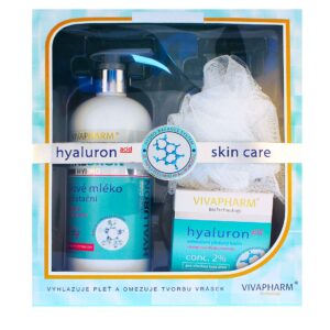 Vivaco Hyaluron Acid Care dárková sada pleťový krém s kyselinou hyaluronovou 50 ml + tělové mléko s kyselinou hyaluronovou 400 ml + masážní žínka