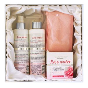 Vivaco Rose Water dárková sada pleťová čistící voda 200 ml + tělové mléko 200 ml + hydratační pleťový krém 50 ml