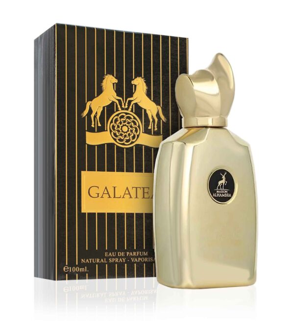 Parfémovaná voda Maison Alhambra Galatea je inspirovaná vůní Godolphin od Parfums de Marly. Tento mimořádný parfém se otevírá explozí vitality a svěžesti díky svým podmanivým vrchním tónům. Ovocné tóny zachycují šťavnatou esenci přírody, zatímco šafrán a tymián dodávají pikantní, aromatický nádech. Yerba maté a cypřiš poskytují živý a energický pocit a doplňují kompozici elegantními zelenými nuancemi. V srdci vůně se rozvíjí rafinovaný květinový buket. Jasmín dodává tón ženskosti a smyslnosti, růže přispívá ke své klasické eleganci, zatímco kosatec dodává lehce pudrový a sofistikovaný tón. A konečně, základní tóny dodávají parfému hloubku a vytrvalost. Kůže dodává nádech síly a charakteru, vetiver dodává zemitý a dřevitý tón, zatímco ambra a cedrové dřevo přispívají k obklopujícímu a okouzlujícímu teplu. Pižmo a vanilka doplňují kompozici a zanechávají hřejivou a smyslnou stopu.