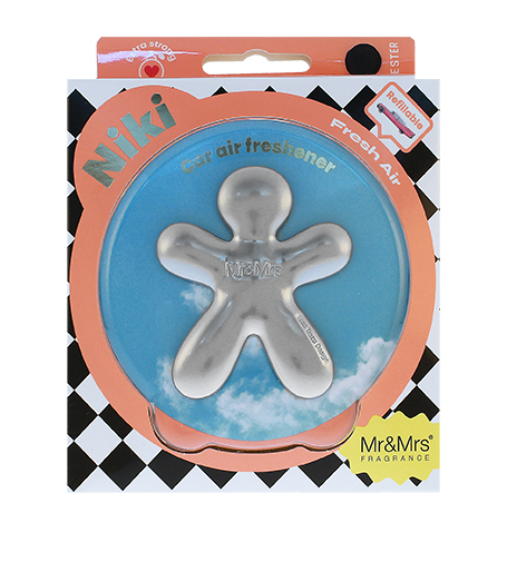 Čerstvý vzduch. Voňavý panáček Niki je designová vůně do auta s vyměnitelnou náplní z parfémované pryže, obsahuje speciální esenciální oleje, které provoní váš vůz po dobu 30 dní. Bojuje s nepříjemnými pachy, jako je například kouř z cigaret a příjemně osvěží vzduch. Neobsahuje alkohol. Panáčka stačí zasunout do ventilátoru auta díky úchytu, který má na zádech. Po vypotřebování lze jednoduše vyměnit náplň se stejnou nebo jinou vůni.