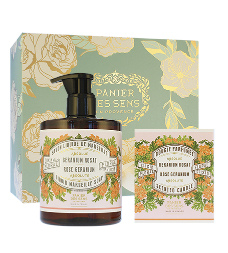 Nechte se unést smyslovým dobrodružstvím s květinovými tóny, které jsou syrové i rafinované. Dárková sada Panier Des Sens Rose Geranium obsahuje tekuté mýdlo na ruce a tělo a vonnou svíčku obohacenou o esenciální olej z pelargonie. Nádherná vůně pelargonie je v parfumerii využívána pro své jedinečné aromatické vlastnosti – je jemná, sladká i silná zároveň. Připomíná vůni růže, ale liší se díky svým světlým, zeleným a citrusovým tónům.