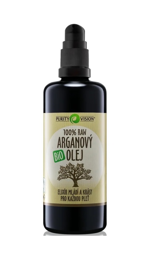Purity Vision Raw Bio Arganový olej je vhodný pro všechny typy pleti, jako pěstící noční a denní olej nebo jako šetrný prostředek pro ošetření citlivé pokožky očního okolí. Arganový olej je marocký elixír mládí a krásy. Arganový olej, je ceněný pro vysoký obsah vitalizujících látek, jako jsou tokoferoly (vitamín E), esenciální mastné kyseliny (vitamín F), karoteny, které mají příznivý vliv na vaši pokožku. 100% Raw Bio Arganový olej Purity Vision oceníte pro jeho jedinečné účinky: – má antioxidační a protistárnoucí efekt, vyhlazuje drobné vrásky – má skvělé regenerační a hydratační účinky, vitalizuje suchou, citlivou, poškozenou, zralou a ke tvorbě vrásek náchylnou pleť.