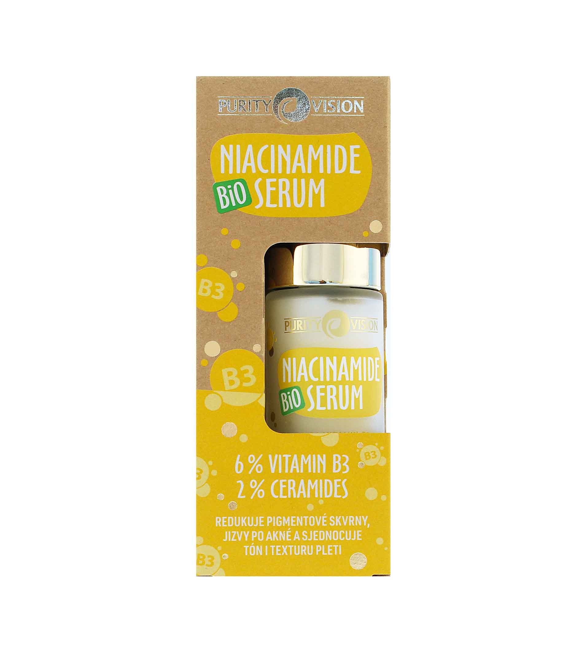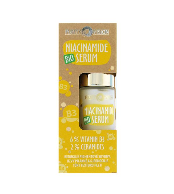 Krásná a vyhlazená pleť? S pleťovým sérem Purity Vision Bio Niacinamide žádný problém. Sérum pomáhá s redukcí pigmentových skvrn, skvrn po akné a poradí si i s nerovnoměrným tónem a texturou pleti. Jedinečná kombinace ceramidů a vitaminu B3 uzamyká v pleti hydrataci, chrání ji a posiluje. Sérum tak viditelně zlepšuje vzhled pleti a hydratuje pokožku. Díky extraktům z měsíčku, heřmánku, vanilky a zeleného čaje má sérum navíc zklidňující efekt. Hedvábné sérum s „vitaminem krasy“ si zaslouží každá pleť. Neobvyklá kombinace zázvoru a pomeranče přináší sladkou a lehce kořeněnou vůni, která má aromaterapeutický účinek.