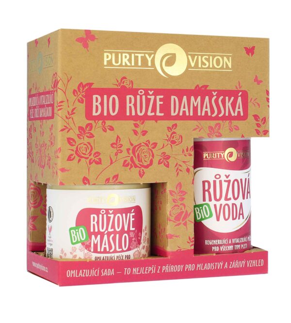 Dárková sada Bio Růže Damašská od Purity Vision potěší každého, kdo má rád přírodní produkty. Bio růžové máslo je vhodné pro všechny typy pleti. Je ideální jako výživný denní a noční krém. Krásně provoní pleť a účinky bambuckého másla přispějí ke hloubkové hydrataci. Bio růžová voda je vhodná pro všechny typy pleti. Zamilujete si ji pro její příjemnou vůni a všestranné využití. Díky elegantnímu flakonu s rozprašovačem nabídne rychlé osvěžení. Výborně také poslouží k zafixování make-upu. Dopřejte sobě nebo vaší rodině přírodní péči v Bio kvalitě od značky Purity Vision.