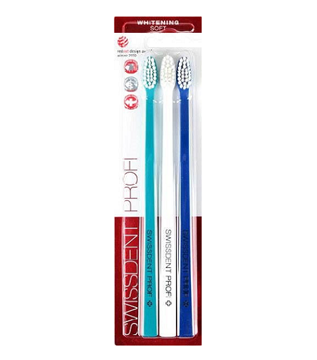 Zubní kartáček s měkkými štětinami Swissdent Profi Whitening Soft. Díky obsahu mikročástic zvyšuje účinek bělicích zubních past Swissdent. Kartáček má malou hlavici, díky níž snadno vyčistíte i špatně přístupná místa a rovnou rukojeť, navrženou podle ergonomie zubařských nástrojů, která zajišťuje pohodlnou manipulaci.