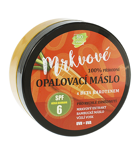 Dopřejte své pokožce zdravé, bronzové a dlouhodobé opálení. 100% přírodní opalovací máslo s mrkvovým extraktem urychluje zhnědnutí pokožky a zabraňuje jejímu stárnutí. Vysoký obsah mrkvového extraktu, betakarotenu a přírodních olejů podporuje zlatavou barvu pokožky.